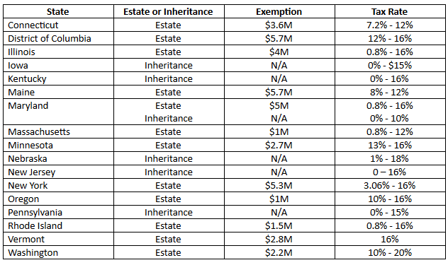 Sixteen states plus the District of Columbia have an estate or inheritance tax, and one state has both. Here’s a breakdown of the states, the type of tax each levy, and the exemptions and rates that apply.